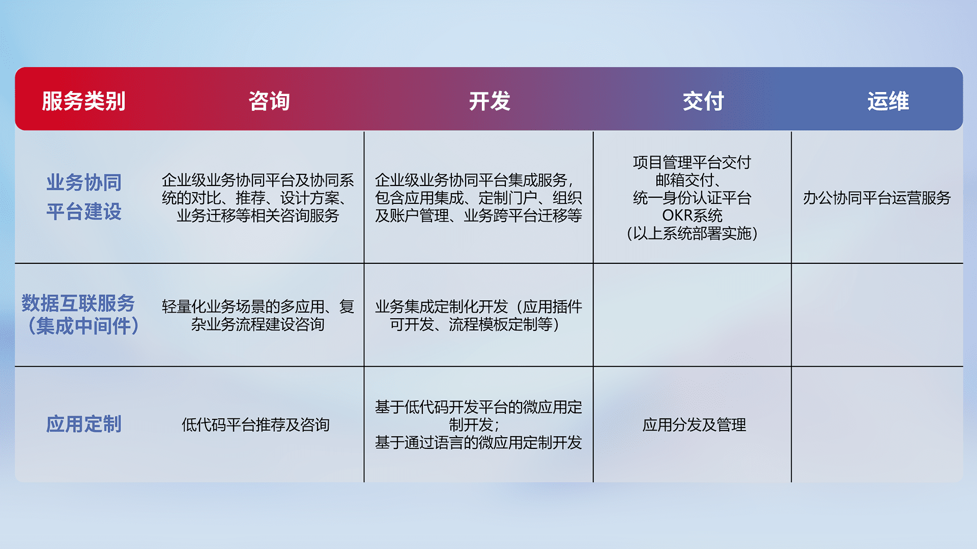 针对钉钉、、、企微、、、IDaas等平台级产品提供产品的规划、、、方案、、、交付、、定制化开发等服务,,,,实现如统一协同办公、、、、智能客户服务、、、、混合会议管理、、、智能数据查询、、等业务场景,,,,实现数字化转型。。